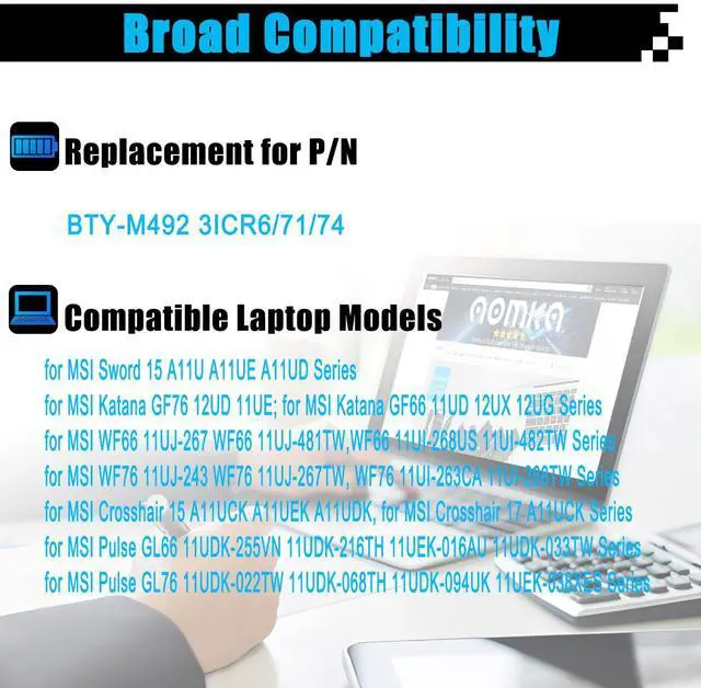 • Compatible Laptop Modelsfor MSI Bravo 15 B5DD Series, MSI Sword 15 A11U A11UD A11UE A11SC Series, for MSI Katana GF66 11UC 11UD 11UE 11SC 12UD 12UE 12UG 12UGS 12UX Series, for MSI Katana GF76 11UC 11UD 11UE 11SC 12UD 12UE 12UG 12UGS 12UX Series, for MSI WF66 11UI 11UJ Series, for MSI WF76 11UI 11UJ Series, for MSI Crosshair 15 A11UCK A11UDK A11UEK B12UEZ Series, for MSI Crosshair 17 A11UCK A11UDK A11UEK Series, for MSI Pulse GL66 11UDK 11UEK 11UCK Series, for MSI Pulse GL76 11UDK 11UEK 11UCK 12UEK Series, for MSI Bravo 15 B5DD C7VE C7VF, for MSI Cyborg