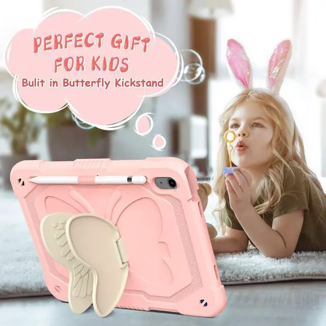 Ambison Compatible with iPad 11th/10th Generation Case 2025/2022 11/ 10.9 inch for Kids Girls with 9H Tempered Glass Screen Protector, Rugged Duty Shockproof, Butterfly Stand, Carrying Strap-Rose Pink