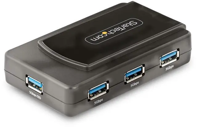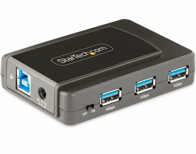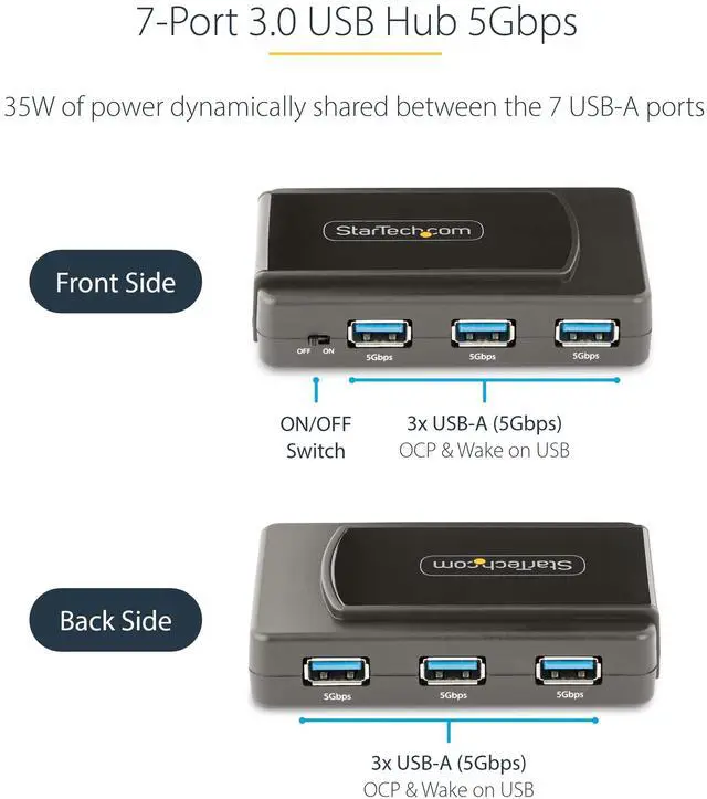This 7-Port USB 3.2 Gen 1 (5Gbps) hub adds seven USB Type-A ports to a computer, with the added benefit of a dedicated on/off switch. The USB hub is self-powered with an included power adapter, making it ideal for a fixed workstation setup. Add Seven USB-A Ports The USB 3.0 hub expands your laptop or desktop computer's USB connectivity, adding seven USB ports. It is backward compatible with USB 2.0, ensuring support for a wide range of USB devices such as thumb drives, HDDs/SSDs, mice, keyboards, webcams and USB headsets.