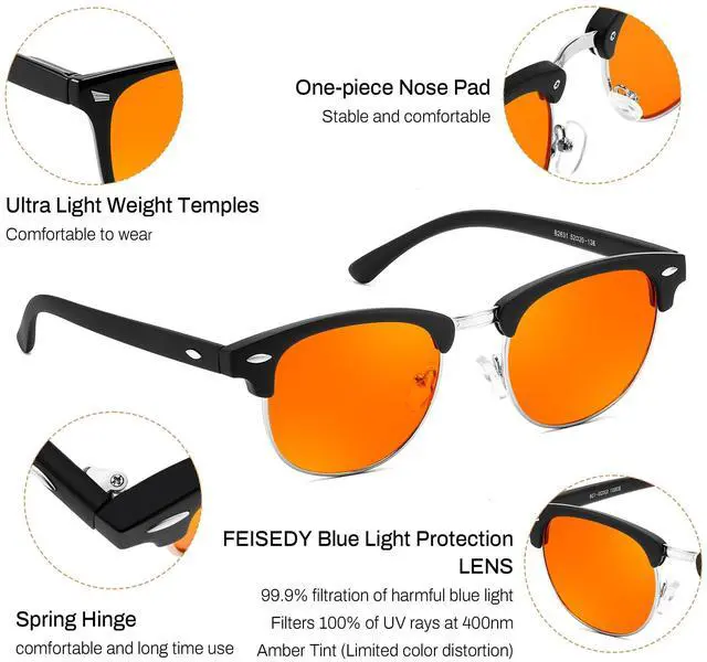 Sleep Glasses - Numerous studies have shown that prolonged exposure to blue light can slow or stop the production of melatonin,Blue light exposure before going to bed will reduce the quality of sleep recovery. FEISEDY AMBER BLUE LIGH GLASSES helping your body produce melatonin faster and fall asleep faster and enjoy a more restful sleep.