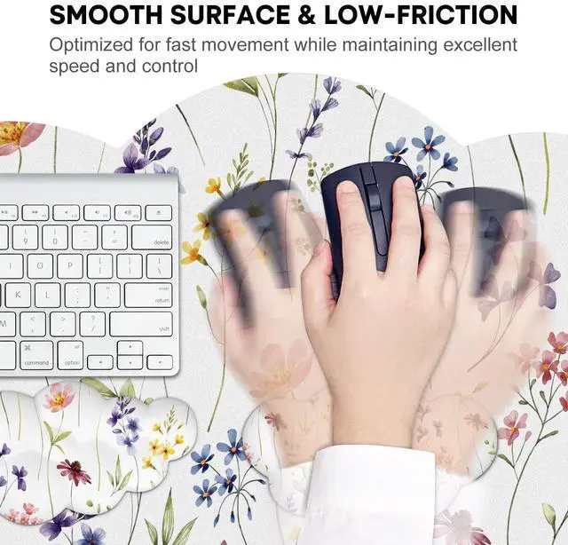 JIKIOU Large Cloud Mouse Pad Waterproof with Cloud Keyboard Wrist Pad and Cloud Mouse Wrist Pad Set, Ergonomic Computer Desk Wrist Support Mousepad for Keyboard and Mouse 35.4x15.7in White Flowers