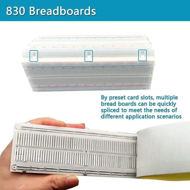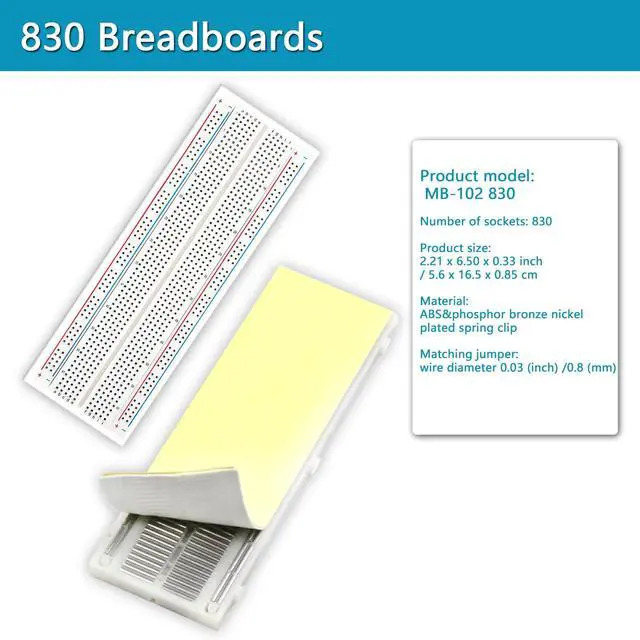 830 tie points breadboards: 3pcs MB102 breadboards, White ABS Plastic Body with Black Printed Legend. With Self-Adhesive Tape on the Back,Inter Connect Any Components with 20-29 Awg (0.3-0.8mm) Wire.