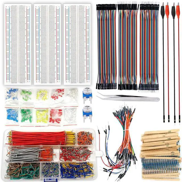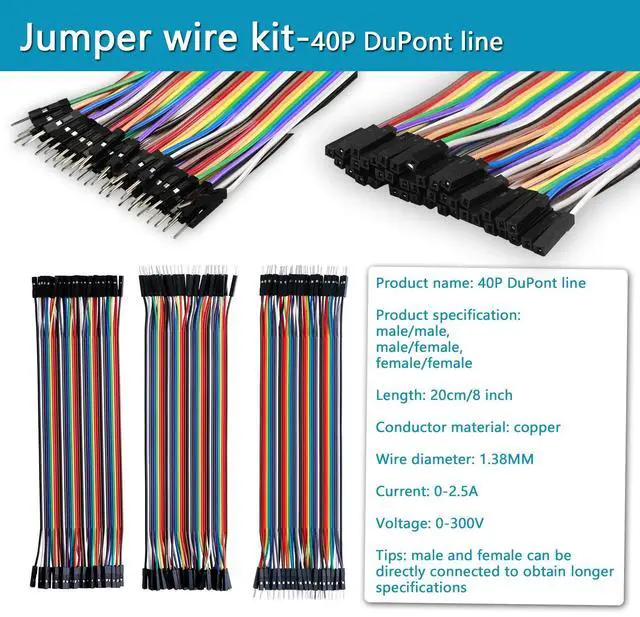 Jumper Wires Kit : 1560Pcs U-Shape Jumper Wires 0.09in,0.2in,0.28in,0.39in,0.47in,0.59in,0.67in,0.79in,0.87in,0.98in,1.97in,2.95in,3.94in,4.92in, 40pcs each size 265Pcs Flexible Breadboard Jumper Wires - 4.72 inch, 6.29 inch, 7.87 inch, 9.84 inch,many kinds of colors and sizes. 3120pcs 20cm (8 inch) 40pin Female to Female jumper wires / 40pin Male to Female jumper wires / 40pin Male to Male dupont jumper wires 44pcs 34cm (13.4 inch) Alligator clip test leads