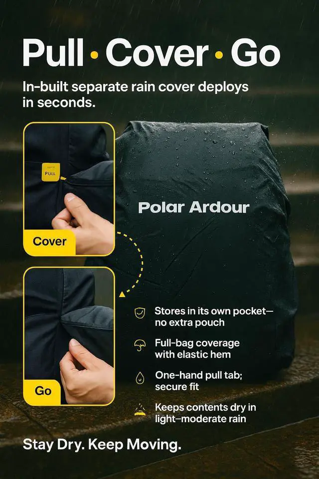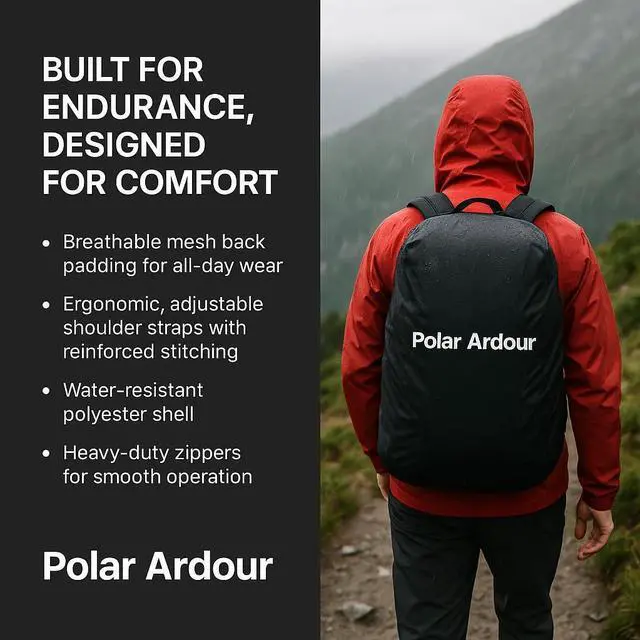 Stay ready for any adventure or daily commute with the Polar Ardour backpack a perfect blend of style, functionality, and durability. Designed with moist-repellent polyester and a 30L capacity, this bag handles your essentials with ease. A built-in rain cover stored in a separate bottom compartment ensures your belongings stay dry. The padded mesh back panel with airflow channels and adjustable shoulder straps ensure maximum comfort, while a curved steel handle and durable metal zippers provide long-lasting strength and utility. Whether it's work or travel, this backpack is built to deliver.