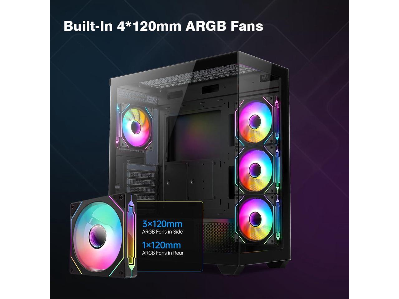 - Pre-Installed Fans Comes with 4 pre-installed high-performance 120mm ARGB PWM Prism fansthree in the front and one at the reardelivering powerful airflow and vibrant lighting out of the box.