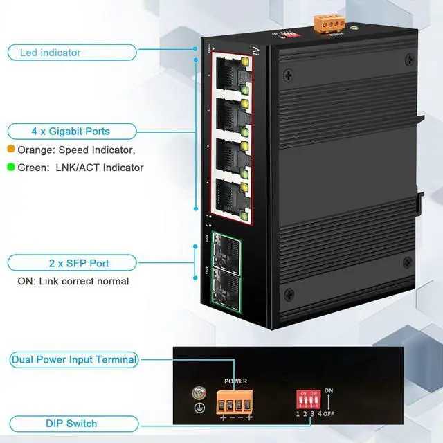 6 Ports Gigabit PoE Switch- Our Industrial Ethernet hub includes 4 x 10/100/1000Mbp IEEE802.3af/at Gigabit Ethernet ports and 2 x SFP ports. Ports 1-4 Compliant IEEE802.3AF/AT standard etc. Support DC 44-55V input power to increase stability of communication network