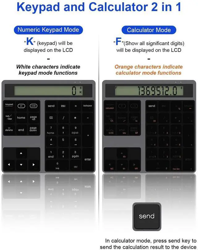 2 in 1 Design of Number Pad and Calculator: The innovative 2 in 1 function perfectly integrates the external numeric keypad and independent calculator, and supports one-key switching mode. Meet the two needs of data entry and real-time calculation, improving office efficiency and convenience. [Note: For calculator mode, refer to the characters marked in yellow for input operation, and for keyboard mode, refer to the characters marked in white. ]