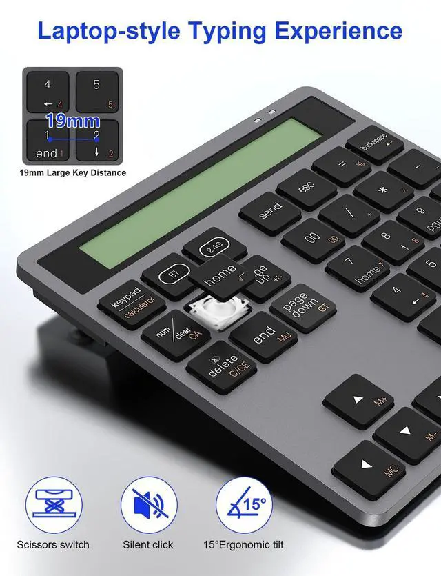 Ultra-thin Body and Comfortable Input Experience: The bluetooth number pad adopts an ergonomic 15° tilt design to keep the wrist in a natural position and reduce the pressure and fatigue caused by long-term use. 34-key full-size layout, sensitive key rebound, comforta