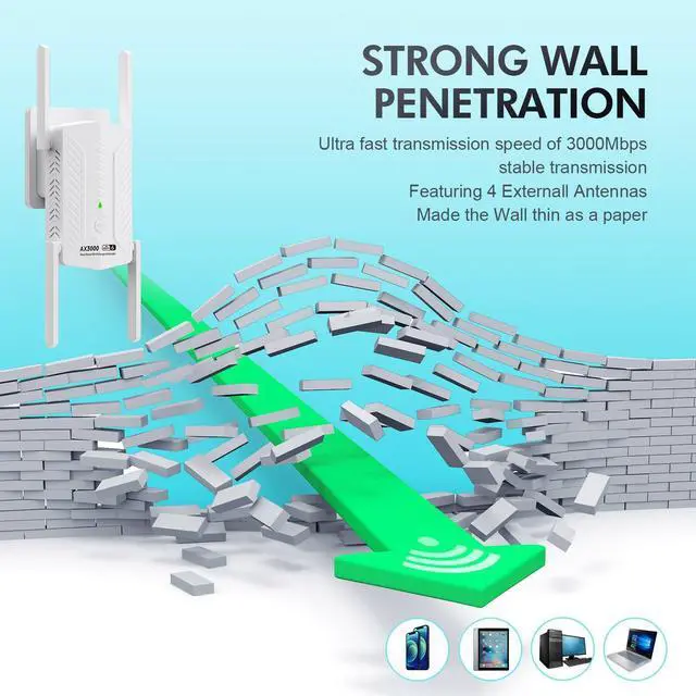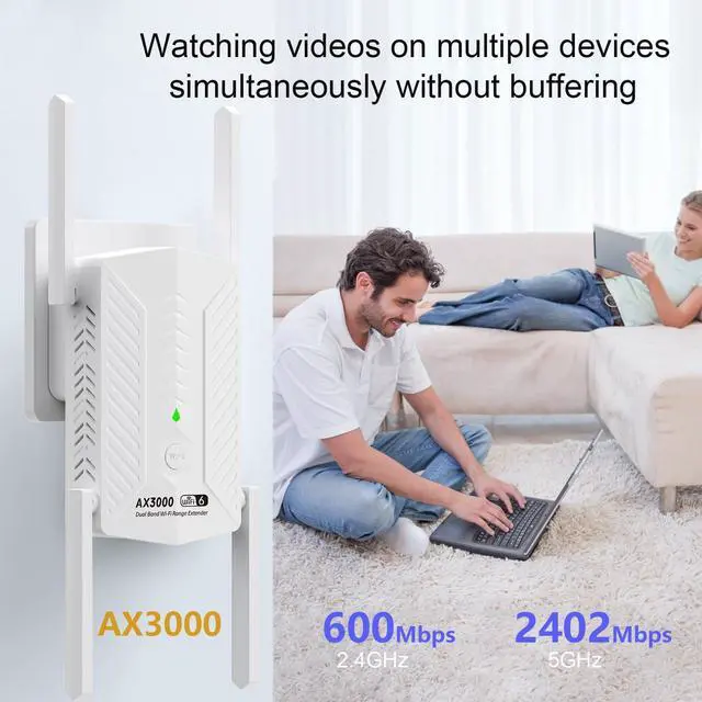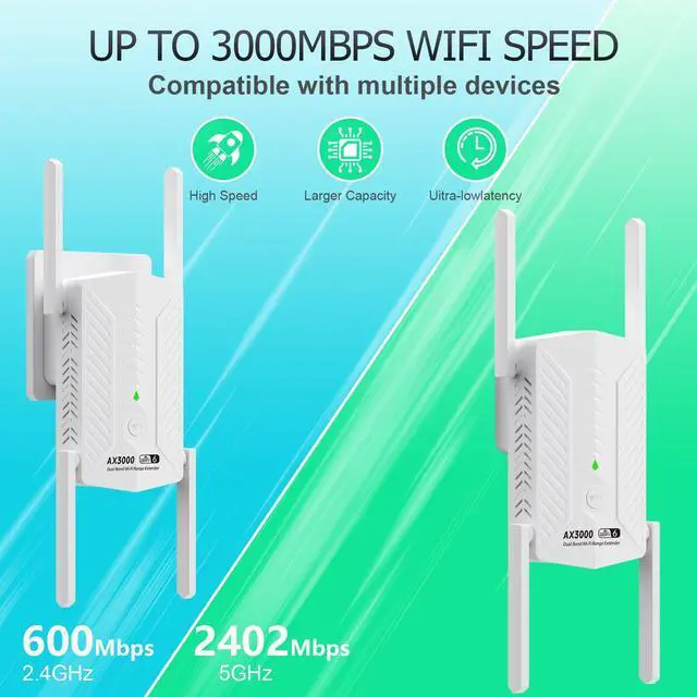 Blazing-Fast AX3000 WiFi 6: Enjoy Full-speeds lag-free online gaming,and stunning 8K high-definition video streaming. The upgraded WiFi booster with dual-band 2.4GHz (600Mbps) and 5GHz (2400Mbps), experience fast connectivity