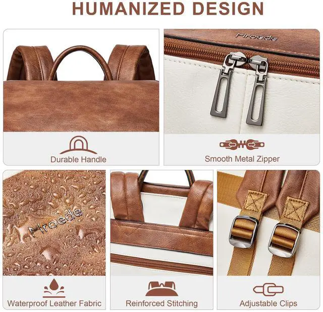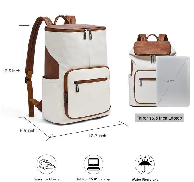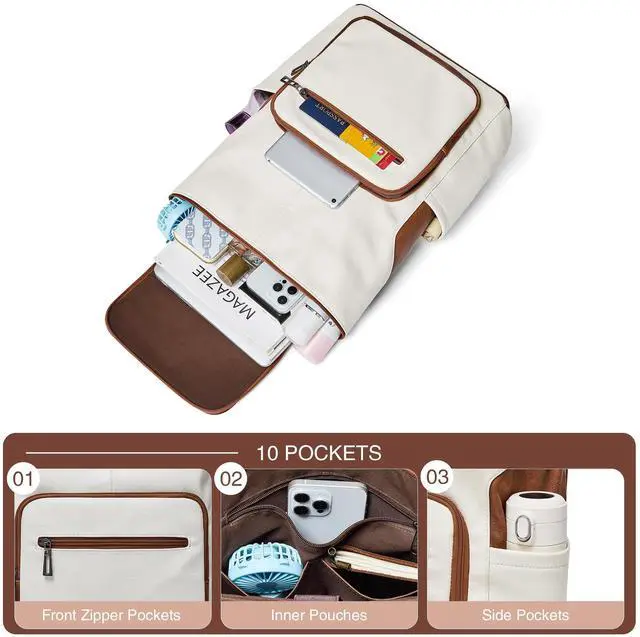 Large Capacity Backpack:This laptop backpack women has 10 pockets for easy storage: 1 main pocket containing 1 laptop compartment with foam, 1 inner zipper pocket, 2 inner open pockets;2 outer side zipper pockets, 2 front zipper pockets and a anti theft back pocket. So you can keep your office documents, cell phone, clothes, etc. in your leather laptop backpack.