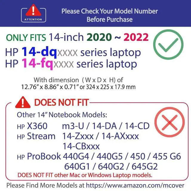 Designed to perfectly fit the 2020 ~ 2022 14"(diagonal) HP Laptop 14-DQxxxx / 14-FQxxxx series with dimension of 12.76 x 8.86 x 0.71 or 324 x 225 x 17.9 mm