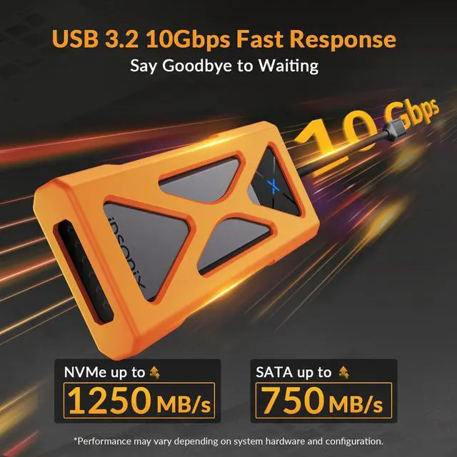 Heavy-Duty Silicone ProtectorThis NVMe Enclosure comes with a heavy-duty silicone protector, which is shock-absorbing and anti-slip, making it more suitable for outdoor use.