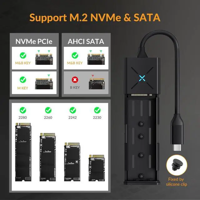 Support NVMe PCIe & AHCI SATA This M.2 to USB-C supports (M-Key/M+B Key) M.2 NVMe PCIe SSD, and (M+B Key) M.2 AHCI SATA SSD. Dont support (B-Key) AHCI SATA SSD.