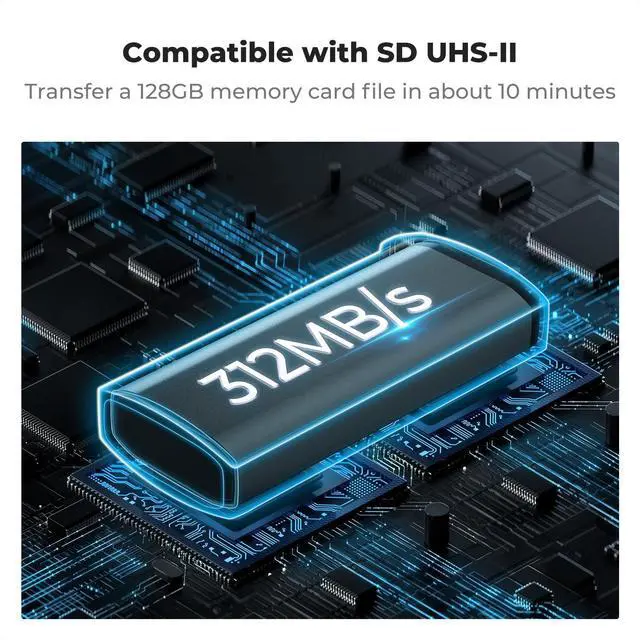 [High Speed Transfer] - USB 3.1 speed with UHS-II protocol support (SD/TF Cards), maximum transfer rate of 312MB/s, enabling rapid data transfer. Supports various memory card types including UHS-II SDXC, SDHC, SD Cards, Micro SDXC, Micro SDHC, Micro SD Cards, and UHS-I Micro SDXC, Micro SDHC, Micro SD