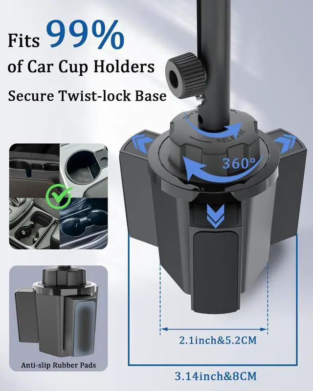 [Expandable Cup Holder Base] This car tablet holder can be adjustable between 2.6"3.94", fitting 99% of car cup holders. The base uses three non-slip silicone extensions to form a triangular stable structure. It is suitable for most cars, sedans, SUVs, trucks, boats, vans and RVs, etc. It is an ideal road trip essential.