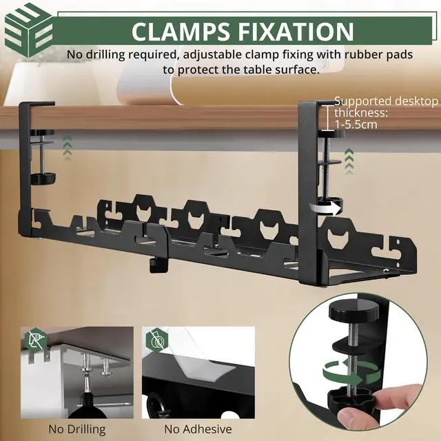 Parameters: Adjustable range 40-74cm (15.7-29.1in), width 13.2cm (5.19in), for desks thickness 5cm (2in), vertical gap of 7.5'', holds up to 15 lbs, perfect computer cable management under desk, home office cord management tray and item storage tray under desk