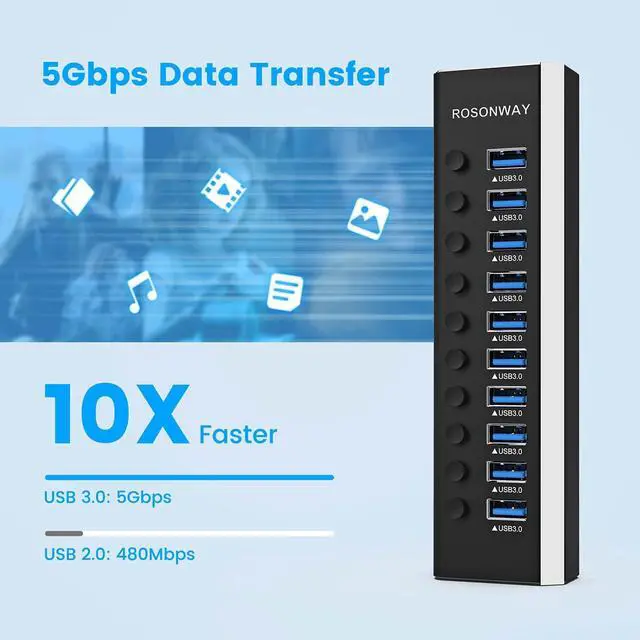 SuperSpeed Data Transfer: 10 blue USB 3.0 ports transfer photos, videos, and music at up to 5Gbps; 10x faster than USB 2.0. USB Splitter made of premium aluminum alloy design that fits naturally for home and workplaces