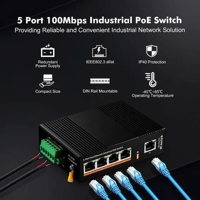 MokerLink 5 Port PoE Industrial DIN-Rail Network Switch, 60W IEEE 802.3 af/at PoE Power, 10/100Mbps Fast Ethernet, IP40 Rated Network Switch (-40 to 185°F), with UL Power Supply