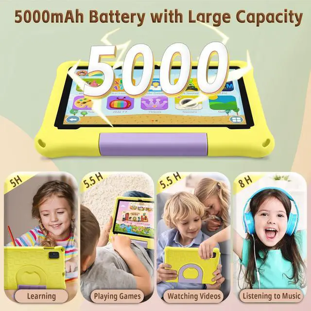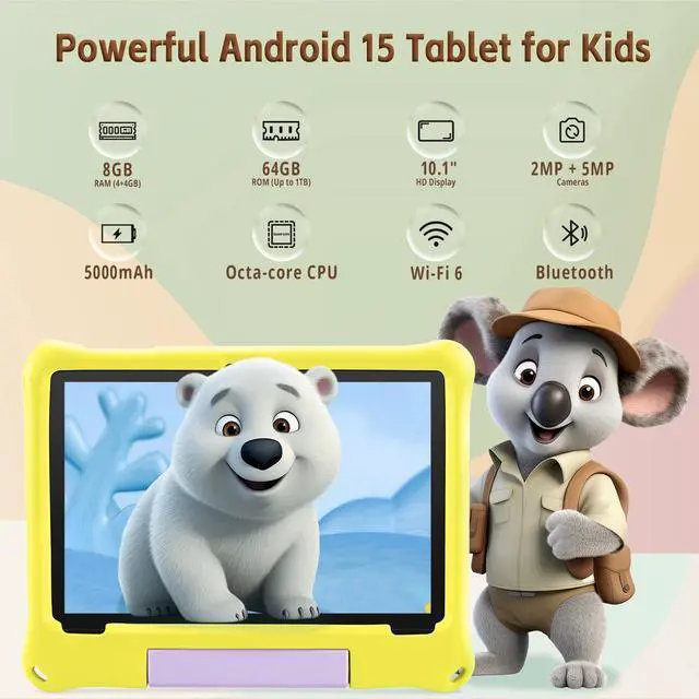 New Edition 10 Inch Kids Tablet with Case Included Latest version 10 inch tablet for kids aged 612. The Ruufuuxy kids tablet runs the latest Android 15.0 operating system and provides an ad-free experience for a safer, more focused environment. It features a 2.0 GHz A523 octa-core processor, 8GB (4+4) RAM, and 64GB ROM. The tablet also includes a microSD card slot for storage expansion up to 1TB (microSD card not included). The large storage capacity and smooth performance allow children to enjoy fast and seamless online activities.