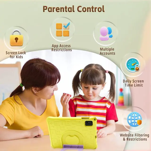 Advanced Parental Controls The Ruufuuxy kids tablet is a safe and easy-to-use android tablet designed for children aged 612. It comes pre-installed with parental control features that allow parents to create and customize individual profiles, manage screen time, set app usage limits, and add child-friendly content. This ensures children can safely explore websites and apps independently, providing parents with peace of mind.