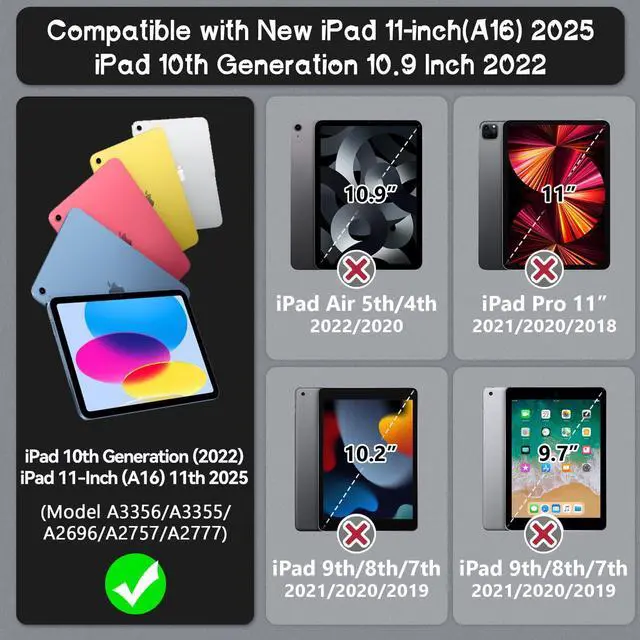 Compatible Models: Grifobes Case compatible with iPad New ipad 11-inch (A16) 2025 / 10th generation 10.9 inch 2022. Model Number: A3356/A3355/A2696/A2757/A2777 (NOTE: NOT for any other 10.9 inch case. NO screen protector or pencil included)