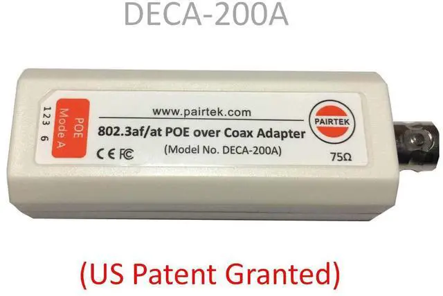 Dualcomm/Paitek patented DECA-200 PoE-over-Coax Adapter Kit is a first of its kind in the industry which includes two adapters (DECA-200A and DECA-200B), one adapter for connecting a Powered Device (PD) such as an IP camera to a Coax cable at one end and the other adapter for connecting the coax cable at the other end to a Power Source Equipment (PSE) such as a PoE enabled Ethernet switch. As such, an end-to-end PoE connection over the coax cable is established for transmission of full-duplex 10/100Base-T Ethernet data and PoE power between the PSE and the PD.