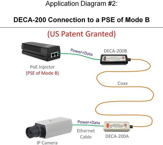 Either DECA-200A or DECA-200B can be used to connect to a PD. For connecting to a PSE, DECA-200A should be used to connect to the PSE of Mode A as defined in the PoE standards 802.3 af/at, and DECA-200B should be used to connect to the PSE of Mode B. The DECA-200 PoE-over-Coax Adapter Kit provides a very cost-effective way to migrate an analog video surveillance system to an IP camera video system by utilizing previously installed coax cabling. It allows you to replace analog cameras with IP cameras at your own pace as each DECA-200 PoE-over-Coax Adapter Kit can be installed independently.