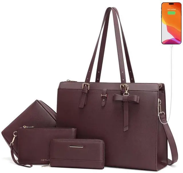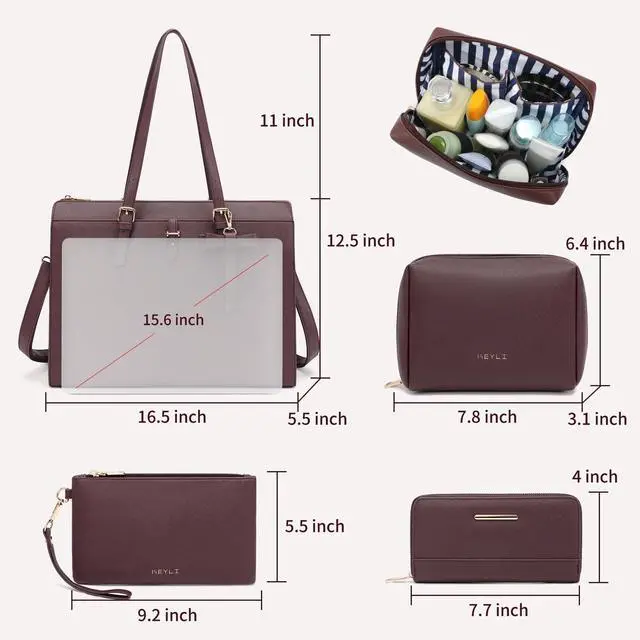 Keyli Laptop Tote Bag for Women Large Waterproof Leather Work Laptop Briefcase with Built-in USB Charging Port Computer Shoulder Bags Fits 15.6 Inch, Business Handbag Purse 4pcs Set Coffee