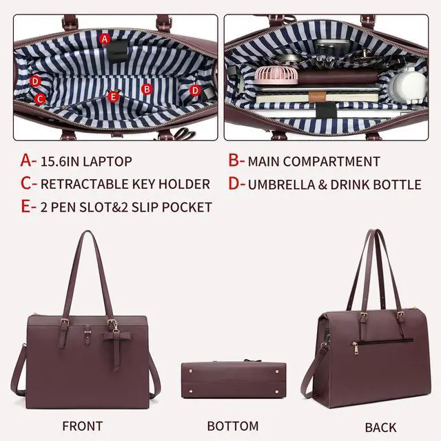 Large CapacityThe laptop bag for women has an independent laptop compartment fits under 15.6 inch laptop and Ipad/tablet, A large main pocket specially designed for documents, books, gadgets. A middle opening pocket and a middle zipper pocket can store all your personal belongings.