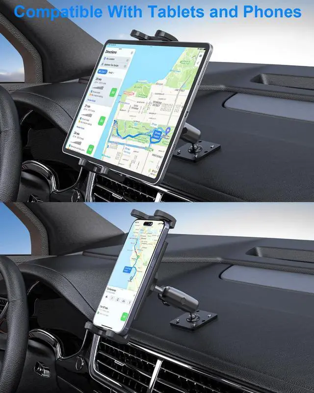 Heavy-Duty Metal Base This car tablet holder features a sturdy metal base with 7 mounting holes that fit the 30x38mm industry-standard 4-hole pattern (AMPS). Comes with two sets of screws for semi-permanent installation on any flat surface. tablet mount suitable for dashboards, consoles in cars/trucks/RVs, walls, desks, and more.