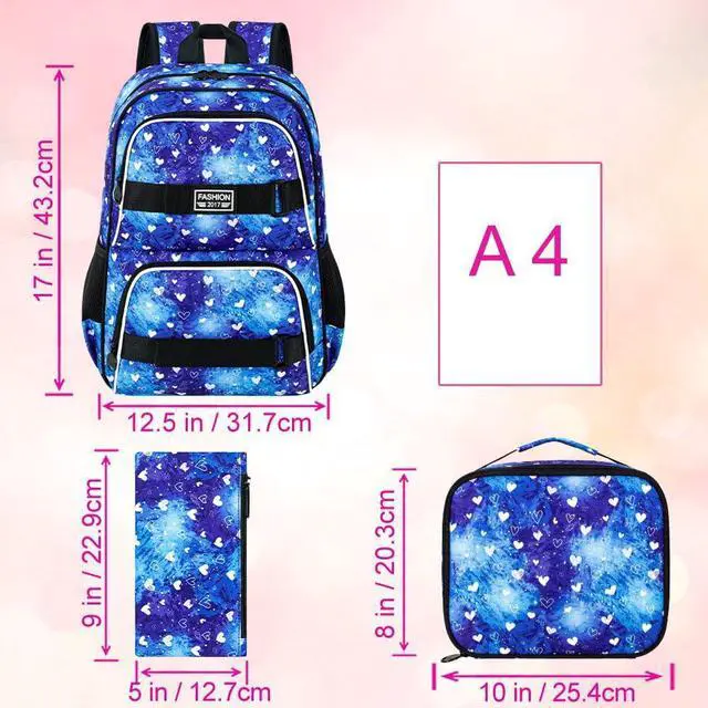 Laptop Backpack Set: Three pieces design, includes a heart backpack (17"x13"x6.5" Inche), a lunch box (9"x8.5"x3.5" Inche) and a pencil bag, reasonable matching can fully meet your daily needs.