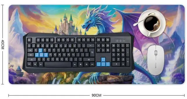 ANMOGID Dragon Gaming Mouse Pad with Stitched Edges, Dragon Desk Mat for Home Office, Anti-Slip, Fantasy Blue Wing Dragon Castle Desk Pad Keyboard Pads Medieval Animals 40x90cm