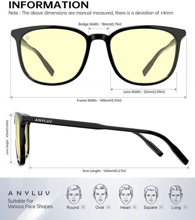 Blue Light Protection: ANYLUV blue light glasses are specifically designed for women to help reduce exposure to harmful blue light emitted from electronic device screens. Whether for extended work sessions or leisure activities, wearing these womens blue light glasses may help reduce visual fatigue and support better sleep by minimizing blue light exposure. A stylish and practical choice for eye care in the digital age.