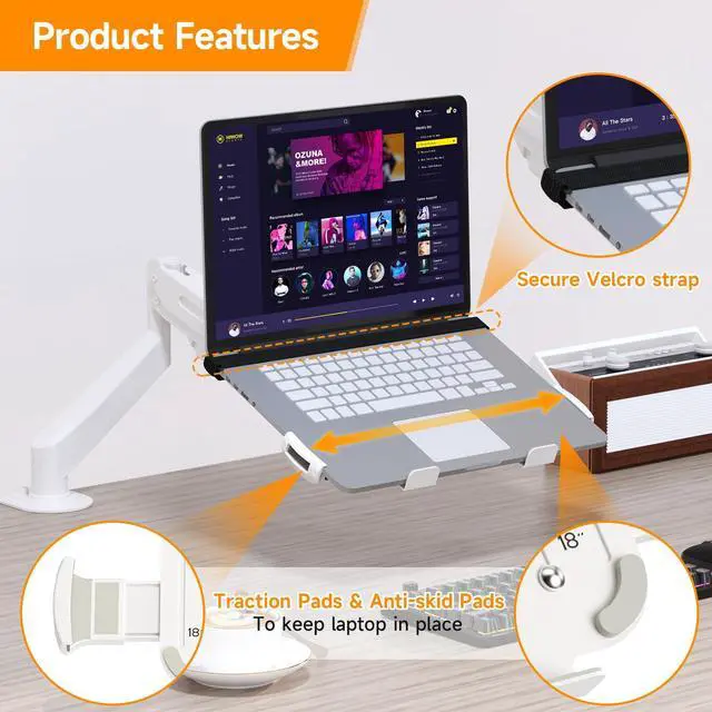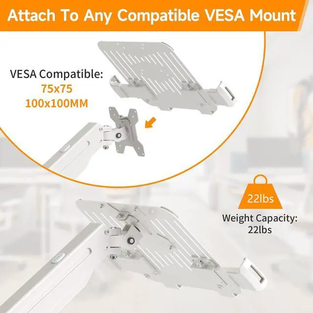 Compatibility: This universal laptop notebook tray fits 13 to 18 laptops and notebooks,and supports weight up to 10lbs, and works with monitor mounts with the standard VESA pattern of 75 x 75 or 100 x 100 mm,(Order only includes the laptop tray. The monitor mount must be purchased separately.