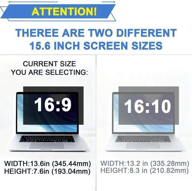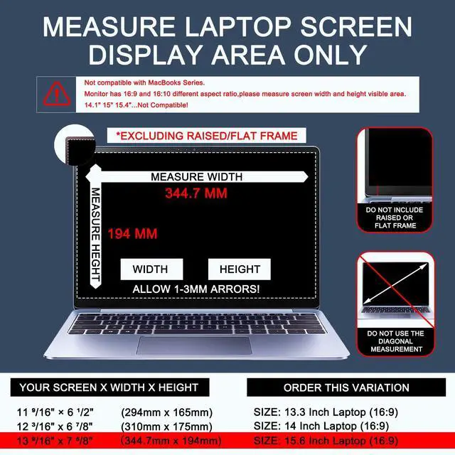 Dimensions & CompatibilityPlease Note: [Not compatible with MacBooks.] Laptop screen privacy shield is designed for 15.6 inch with Aspect Ratio 16:9 laptop.Width: 13 9/16" (13.6 inches/345 mm), Height: 7 5/8" (7.6 inches/194 mm), Diagonal: 15.6" (396.24 mm).compatible with Lenovo, HP, Dell, Acer, Asus, Samsung, Levono, and other laptop brands.Please verify your screen's width and height measurements before ordering as it's not recommended to only measure your screen's diagonal size.
