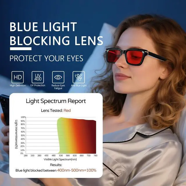 Improving Sleep - Rigorous testing has confirmed that R.F.YFQH red lenses block 100% of blue light in the "melatonin suppression zone" (400-500 nm), helping your body produce melatonin faster and promoting better sleep.