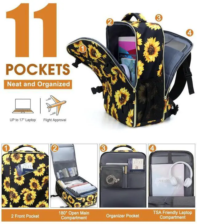 Capolo Travel Backpack for Women Men Waterproof Laptop Backpack Flight Approved Carry On Backpack Overnight Weekender Bag College Bookbag for Business, Work, Traveling Fits 17 '' Laptop,Sunflower