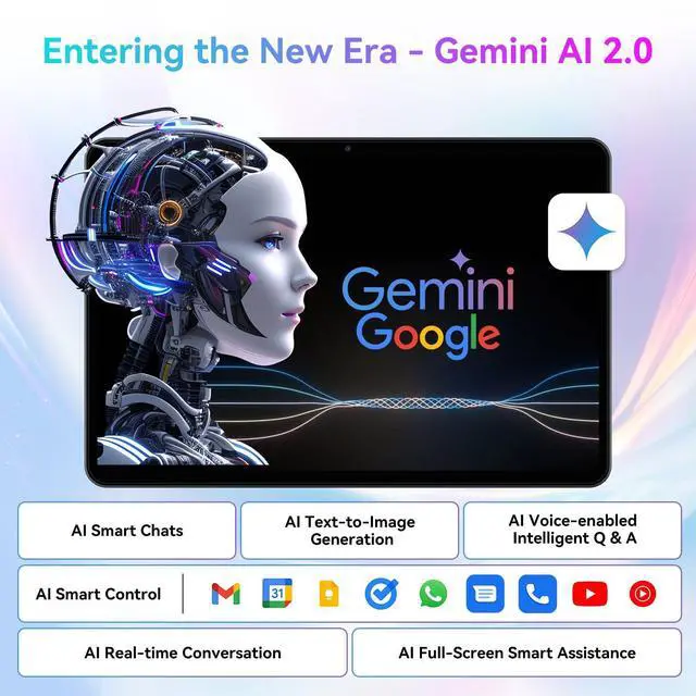 AI Tablet with Gemini 2.0 Your Personal Assistant This intelligent AI tablet is powered by Gemini 2.0, offering real-time smart assistance to help you translate, summarise, schedule, and learn more effectively. Whether for students, remote workers, or families, Gemini adapts to your needs for a smarter lifestyle.