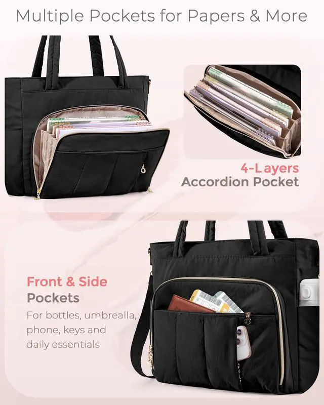 Marscamd Teacher Tote Bag for Work with Accordion Pockets & Crossbody Strap, Large Laptop Tote, Black
