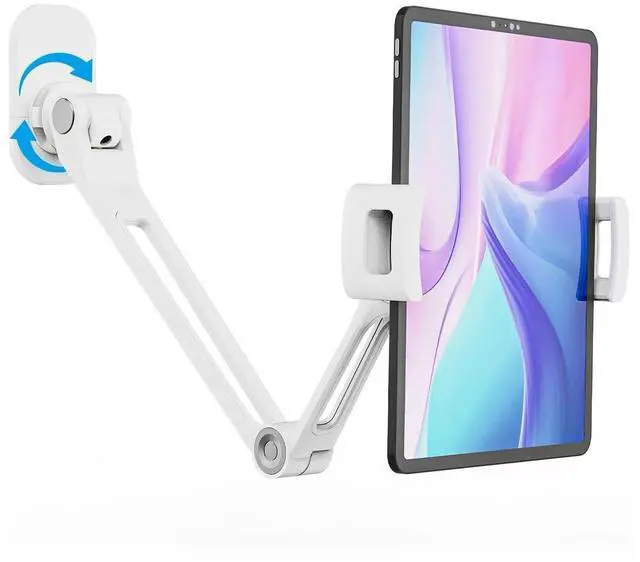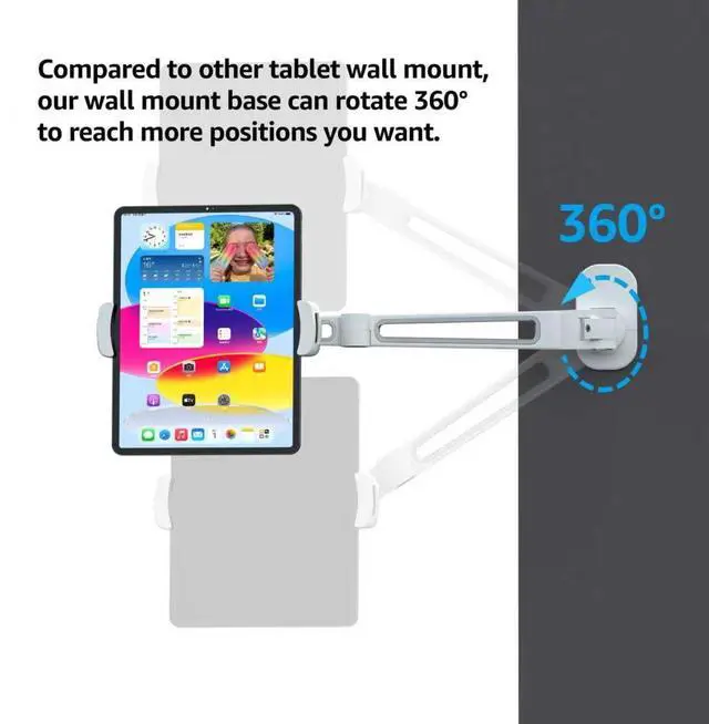 [360°Swivel Base]Most tablet wall mount bases can't rotate, which means that if the postion of the base is not suitable after installation, it will be very difficult to adjust the angle.Our tablet wall mount base can 360°swivel,the arm can be rotated 135°or fully folded,and the clamp can be rotated 360°.Mult-angle adjustment,each joint can be rotated and fixed to the position you want.