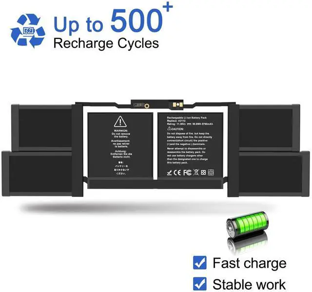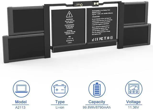 SpecificationsBattery Model :A2113 ;Product Type: Replacement battery; Battery Type: Li-ion; Voltage: 11.36V; Capacity: 99.8Wh/8790mAh; Battery Life: Up to 500 recharge cycles over the life of the battery