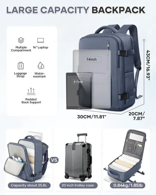 Travel Backpack Women, Carry On Backpack for Men, Hiking Laptop Backpack Waterproof Outdoor Sports Rucksack Casual Daypack, Grey Blue