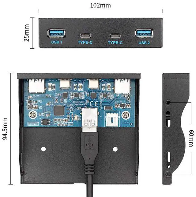 Cablecc USB-C & USB 3.0 HUB 4 Ports Front Panel to Motherboard 20Pin Connector Cable for 3.5" Floppy Bay