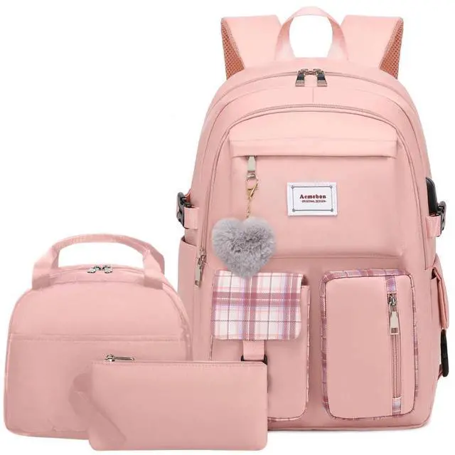 Acmebon Girl Roomy Fashion Laptop Backpack Set Casual Daypack Set for Women Pink