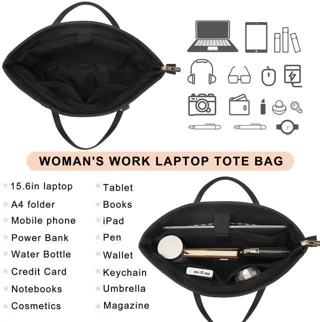 YZAOLL 15.6 Inch Laptop Tote Bag for Women,Water-resistant Vegan Leather with Anti-Scratch Padded Sleeve,Lightweight Multi-Pocket Work Bag for Business Travel,College,Office Essentials,Black