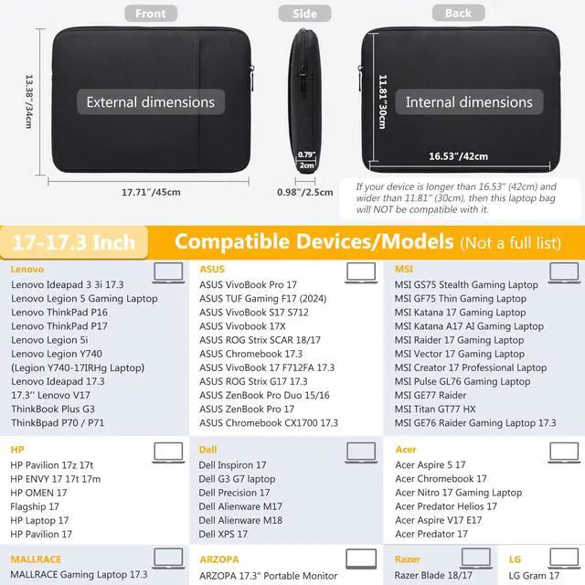 Internal Dimensions: 16.53" x 11.81" x 0.79". Compatible with HP Laptop 17, HP Pavilion/ENVY/OMEN/Flagship 17, ASUS VivoBook (Pro) 17, ASUS ChromeBook 17.3, ASUS ZenBook Pro 17, ASUS ROG Strix Scar 17, ASUS TUF Gaming F17, Dell Precision/XPS 17, Dell Alienware M17/M18, Lenovo Ideapad 3 3i 17.3, Lenovo ThinkPad P17, Lenovo Legion 17.3, Acer Chromebook/Nitro/Aspire 5 17, Acer Predator (Helios) 17, MSI Gaming Laptop 17, Razer Blade 17/18, MALLRACE Gaming Laptop 17.3, LG Gram 17, etc.