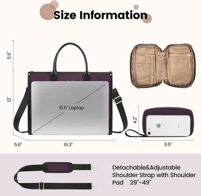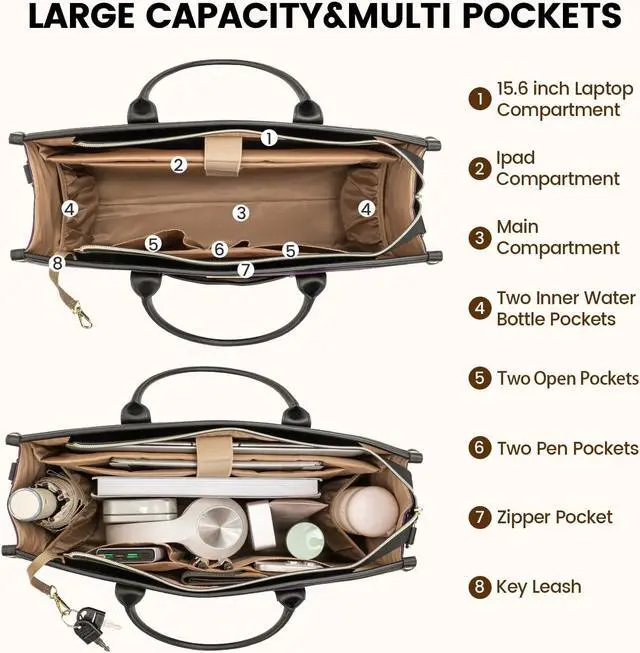 Effortless Organization & Ample Space: This stylish laptop bag for women (Dimensions: 16"L x 12"H x 5.6"W) is designed to cater to your organizational needs. Laptop purse boasts well-padded compartments perfectly suited for A4 documents, folders, a 15.6" laptop, and a 13-inch tablet, ensuring their safety during transport. With specialized pockets for water bottles and umbrellas, along with a convenient keychain holder, everything has its dedicated place.