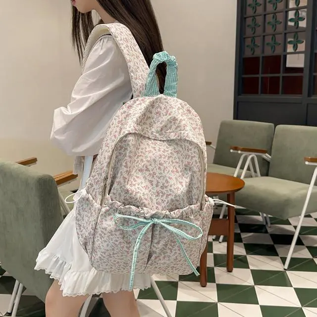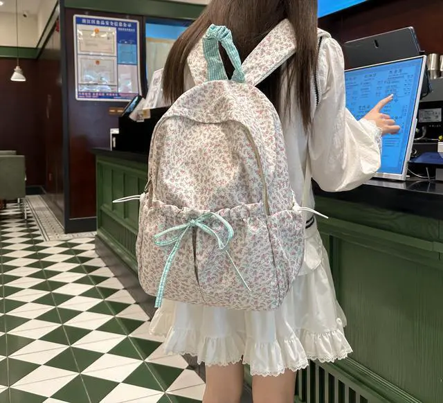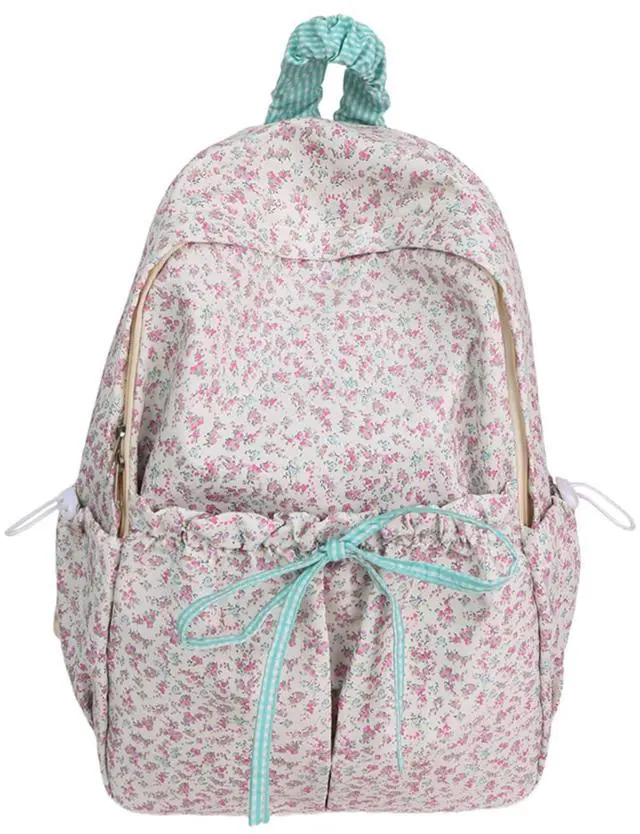 Stylish and Cute Design: This Aesthetic Backpack features a charming floral pattern that exudes a cute and kawaii vibe. The front pocket is adorned with a blue gingham bow, adding a preppy and coquette touch. The drawstring closure with a ruffled edge not only looks stylish but also provides easy access to your necessities