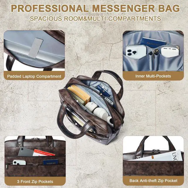 VERSATILE LAPTOP BAG-The dimension of this Retro and fashion Laptop Bag for Men is 16.1"L x 4.9"W x 11.9"H;Weight:2.35 LB.Lightweight design easy to carry perfectly fit for people in college,business and work.Multi usage methods it can be used as a Business leather Laptop Bag,Crossbody Messenger Bag and Shoulder Bag,you can also remove the shoulder strap use it as a Professional Leather Briefcase and carry it use the leather padded handle that could effectively relieve your hand fatigue