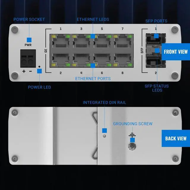 Teltonika TSW210 Industrial Unmanaged Ethernet Switch - 8 Port Gigabit Switch with High Speeds Up to 1 Gbps - 2 SFP Ports for Long-Range Fiber-Optic - 8 x RJ45 Ports, 10/100/1000 Mbps Network Switch